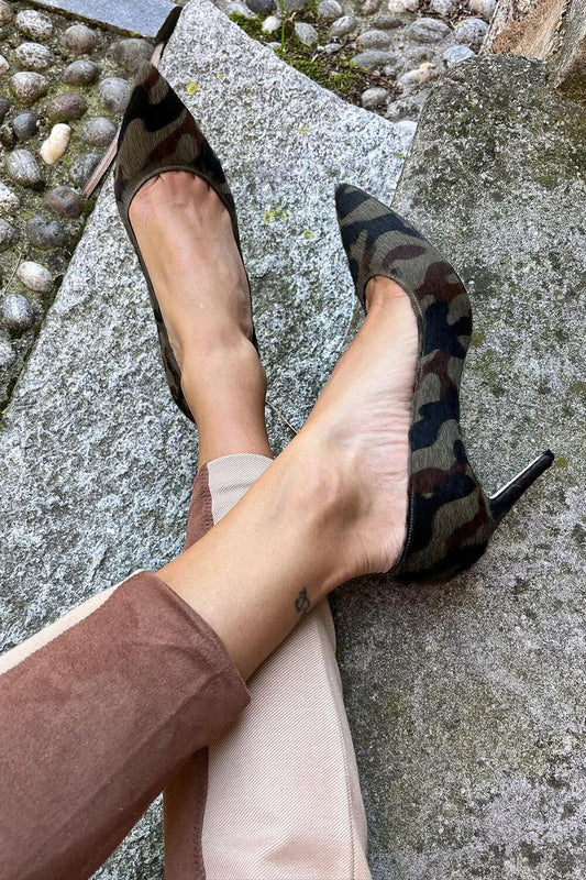 Scarpe con tacco a spillo verde militare con stampa mimetica e punta affilata [Pre-ordine]