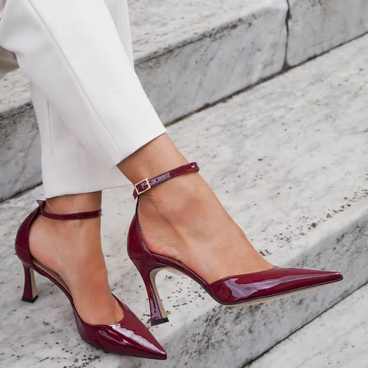 Scarpe con tacco a spillo bordeaux, cinturino alla caviglia, fibbia e punta affilata [Pre-ordine]