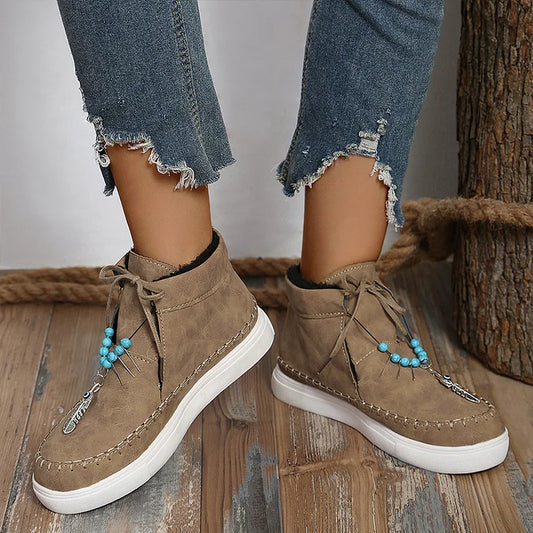 Sneakers alte con punta tonda, perline, metallo, piume, cuciture decorative