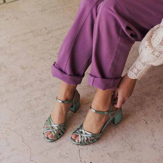 Bellissime scarpe con tacco grosso, punta aperta, colore verde, con cinturini incrociati [Pre-ordine]