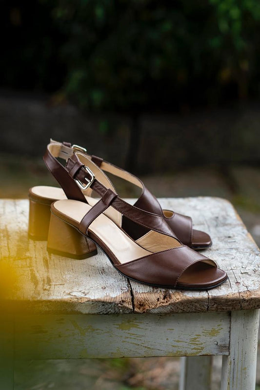 Scarpe con tacco grosso marroni con punta aperta, cinturino asimmetrico e fibbia in tinta unita [Pre-ordine]