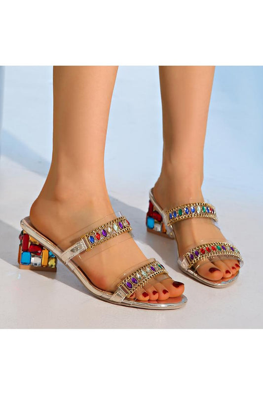 Scarpe con tacco grosso casual a punta tonda con decorazione a catena con strass multicolor