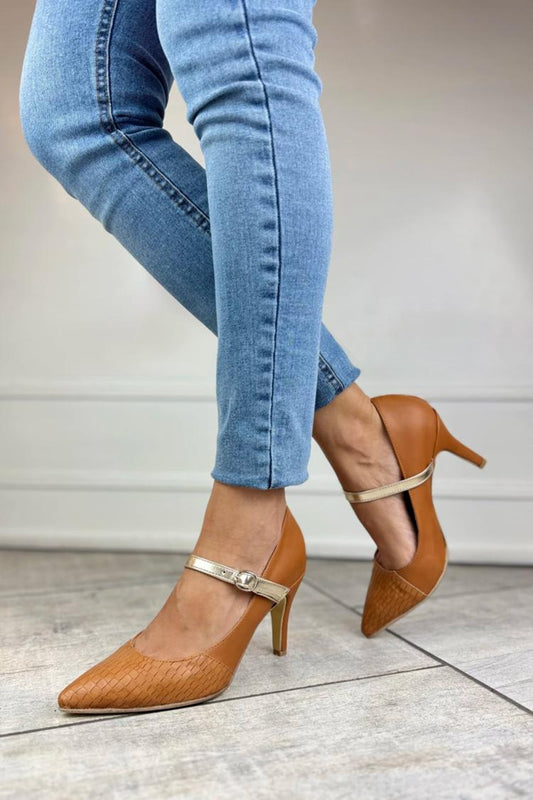 Scarpe con tacco a spillo marrone chiaro, cinturino con fibbia sul collo del piede e punta affusolata [Pre-ordine]