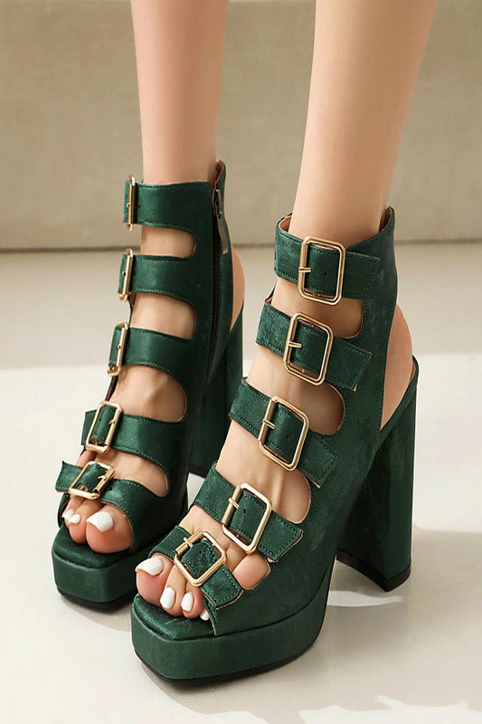 Scarpe con tacco grosso, punta aperta, fibbia, cerniera e cinturino alla caviglia in tinta unita