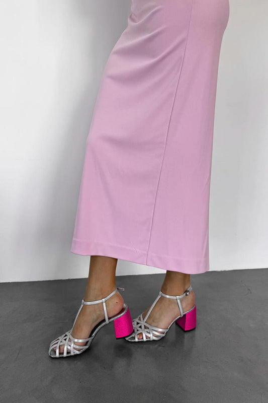 Scarpe con tacco grosso color argento, punta quadrata traforata e cinturino a T [Pre-ordine]