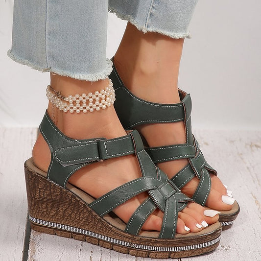 Sandali alla moda con zeppa, cinturino in punta con strass e chiusura intrecciata magica