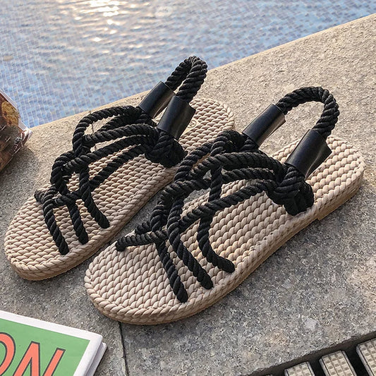 Sandali casual con cinturino incrociato all'uncinetto e cinturino in corda semplice