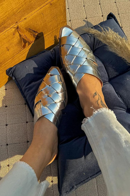 Pantofole di lusso con punta a punta, in tessuto argentato metallizzato lucido [Pre-ordine]