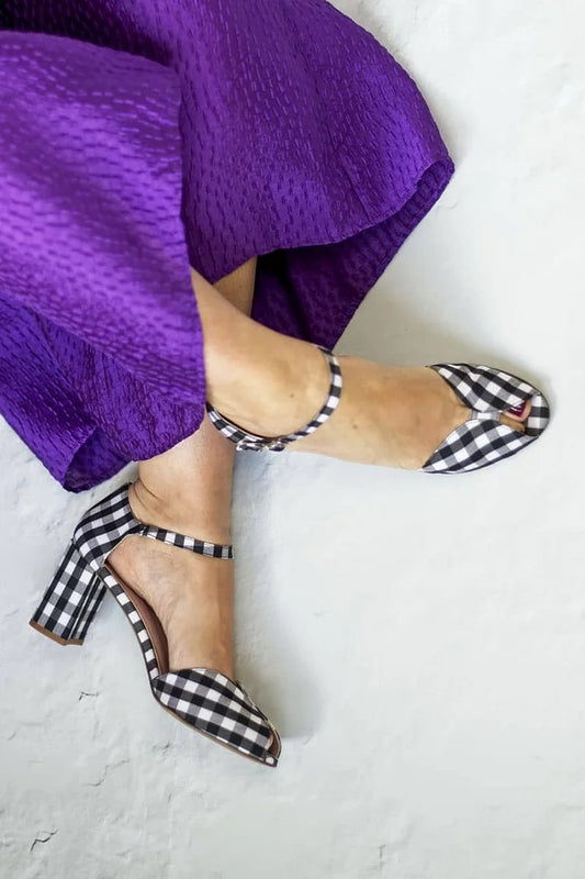 Scarpe con tacco grosso nere con cinturino alla caviglia e punta aperta a quadri [Pre-ordine]