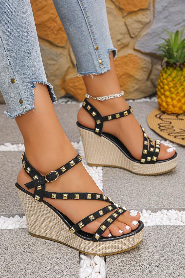 Zeppa con cinturino alla caviglia, fibbia, punta rotonda, rivetti in metallo decorati