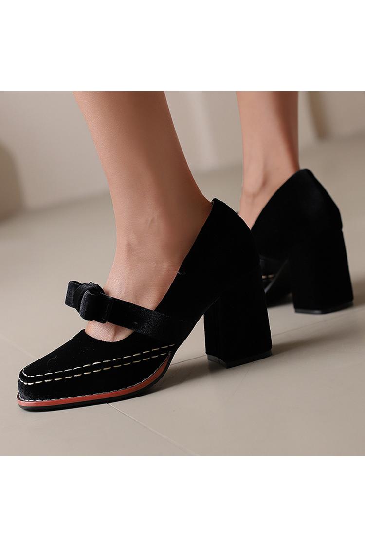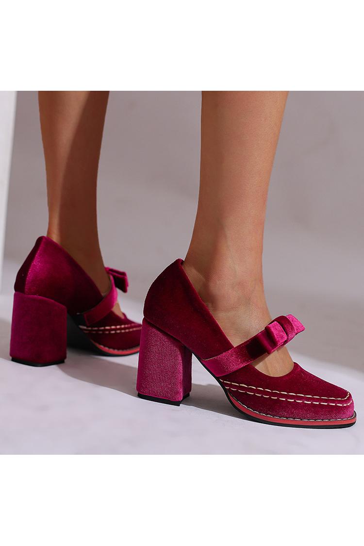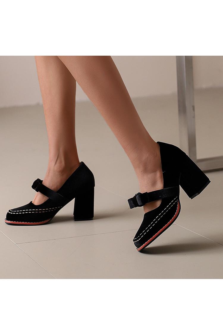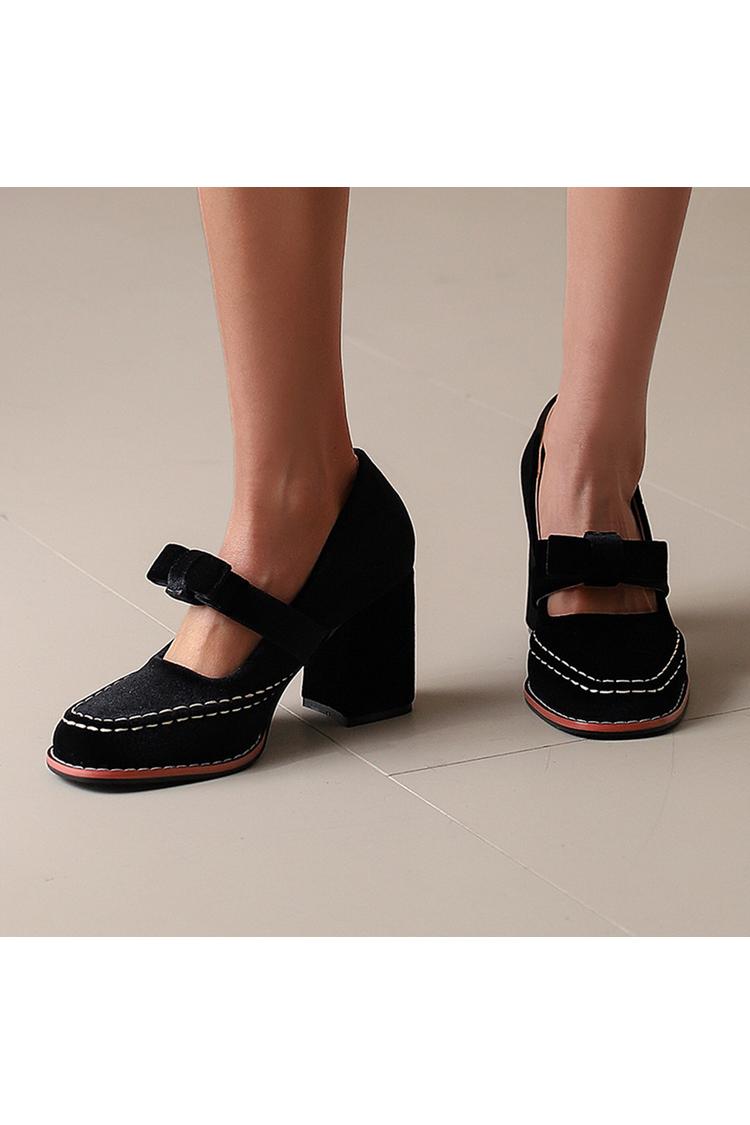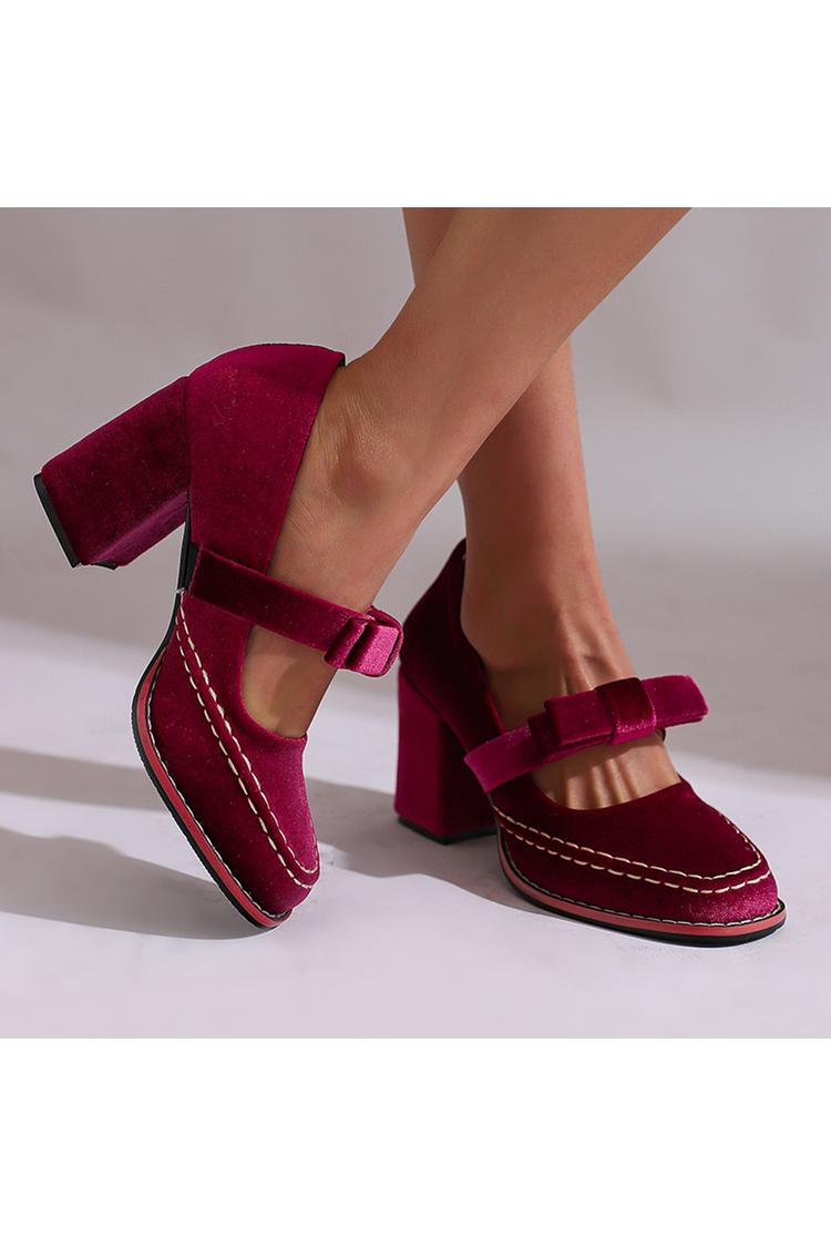 Punta tonda, tacco grosso, cinturino sul collo del piede, dettagli cuciti, fiocco decorativo