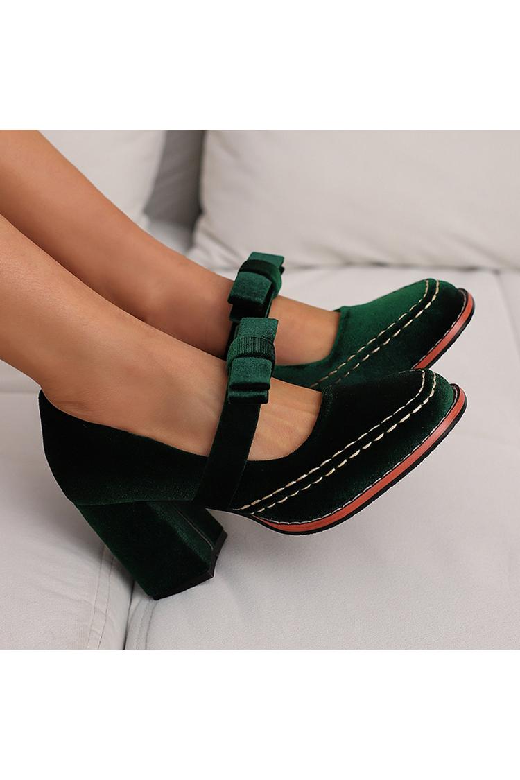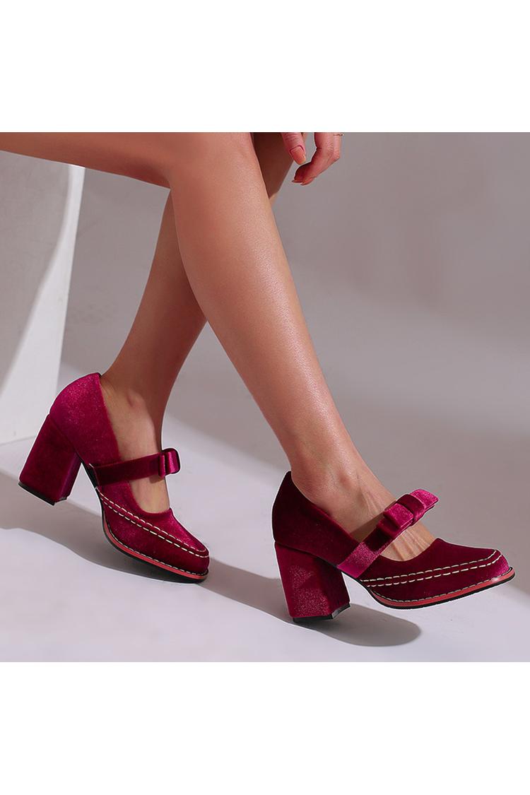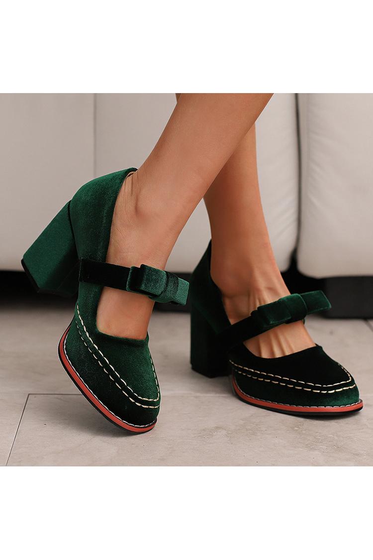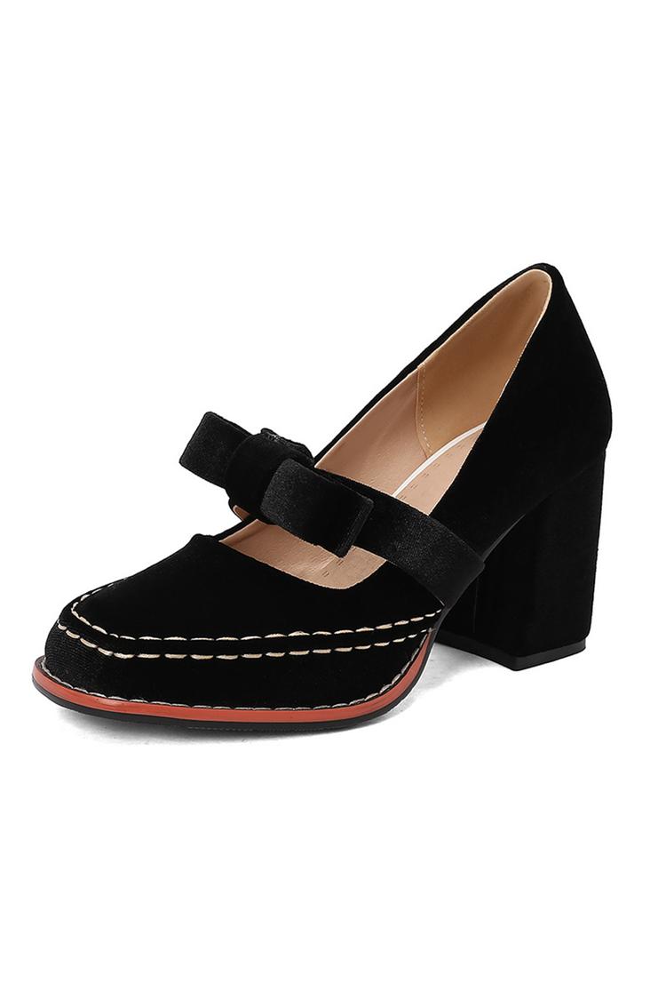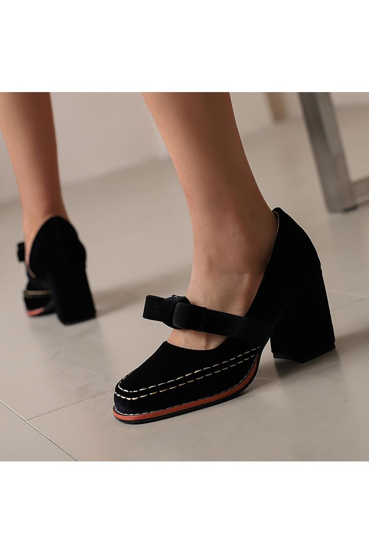 Punta tonda, tacco grosso, cinturino sul collo del piede, dettagli cuciti, fiocco decorativo