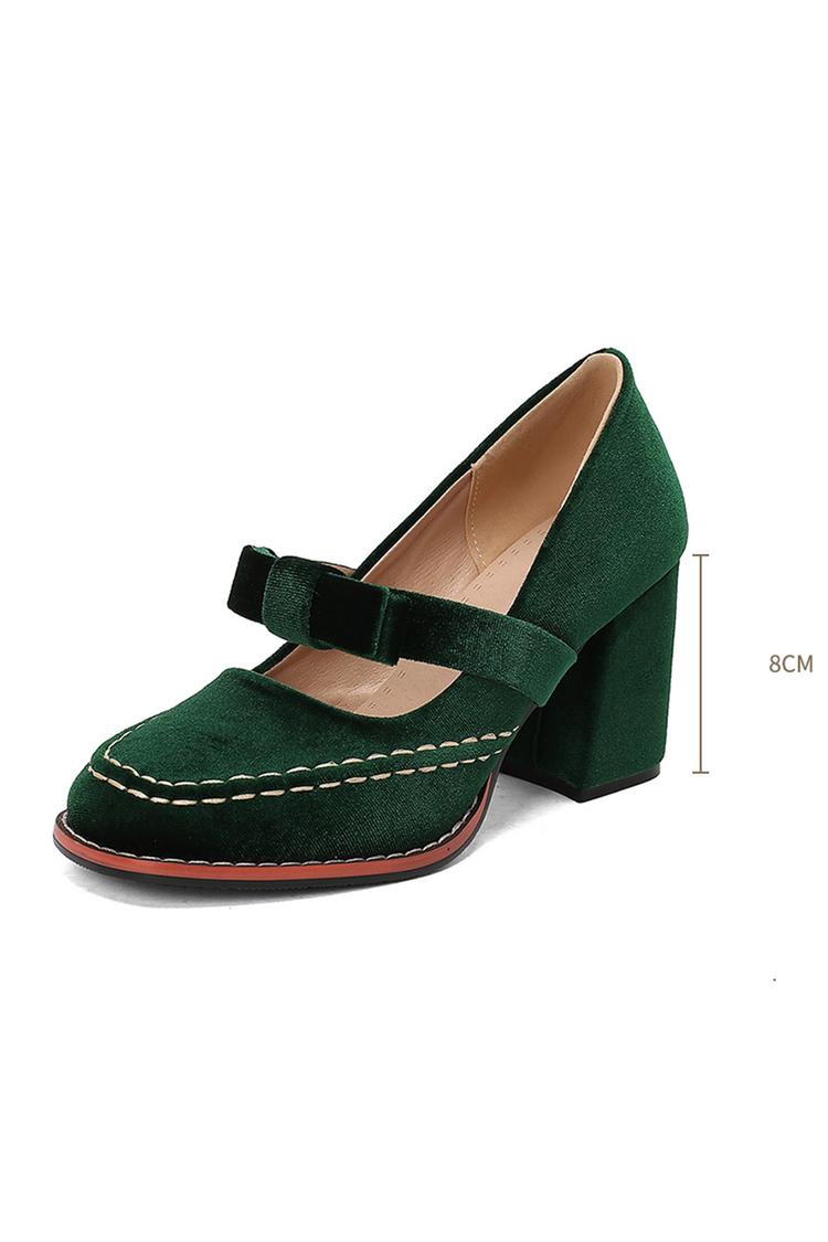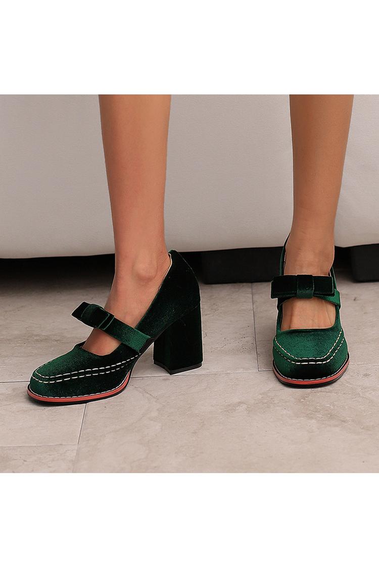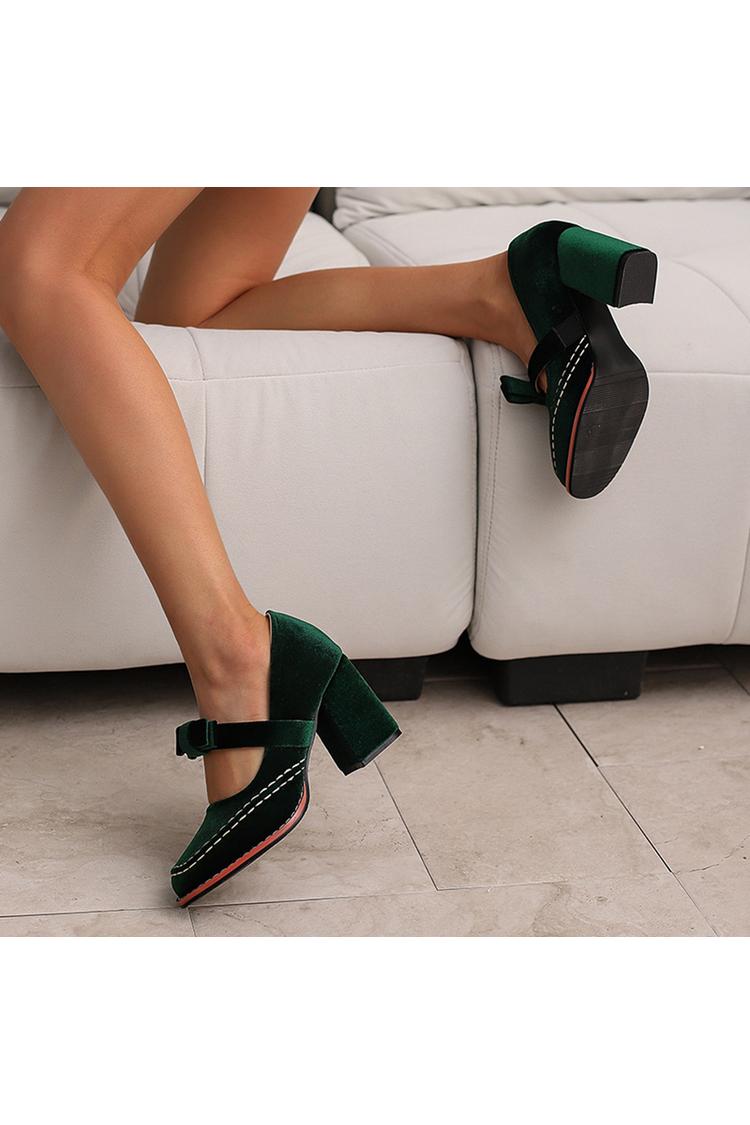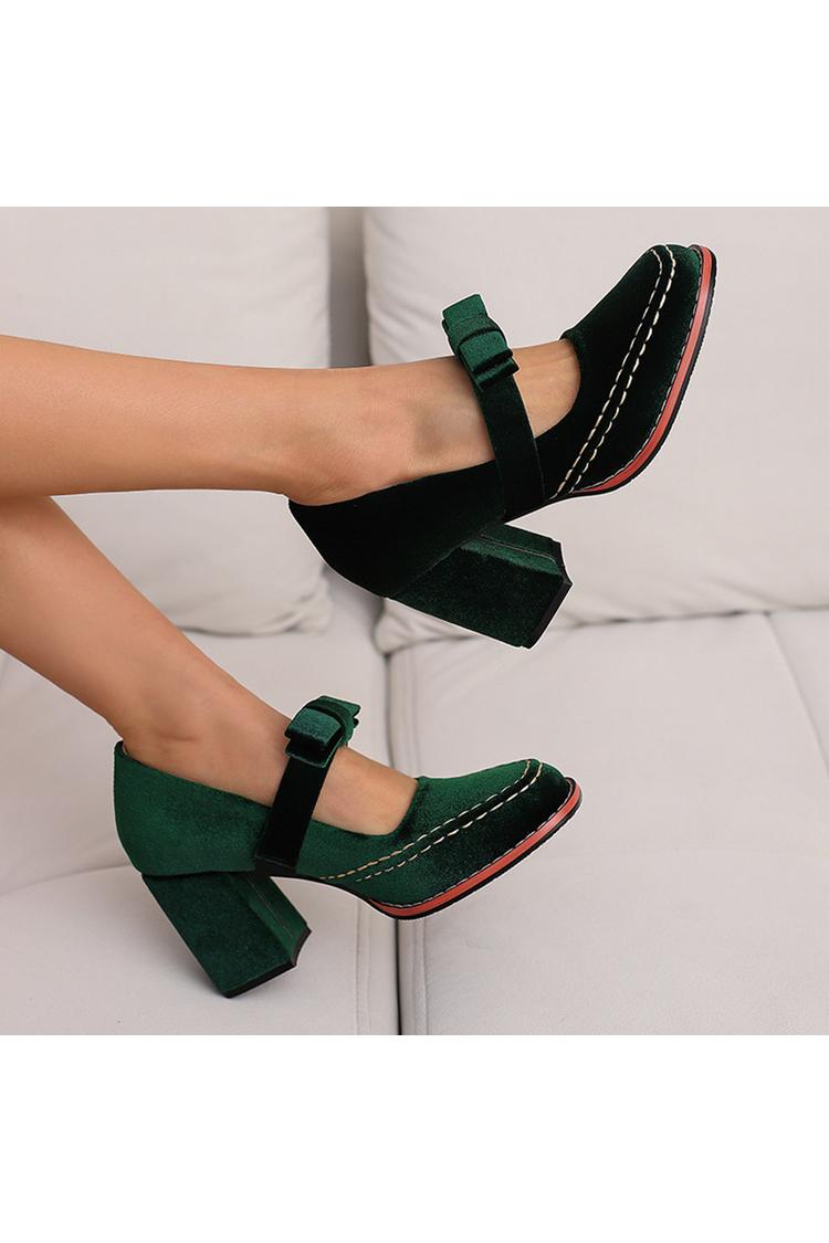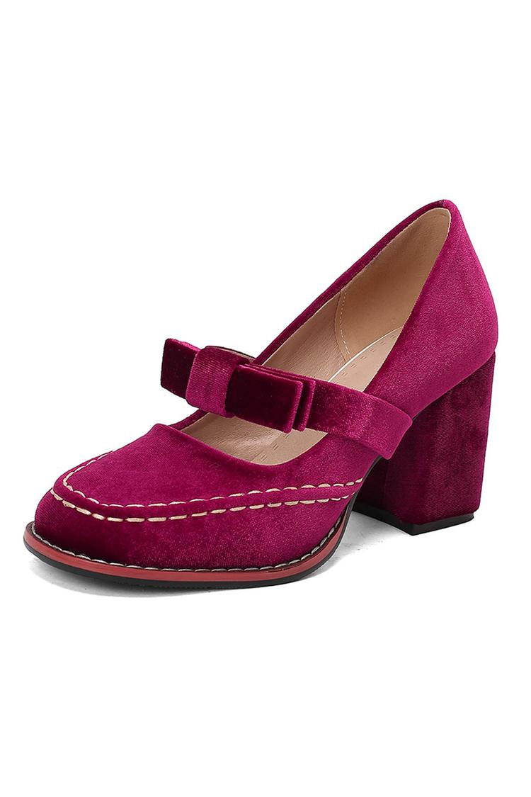 Punta tonda, tacco grosso, cinturino sul collo del piede, dettagli cuciti, fiocco decorativo