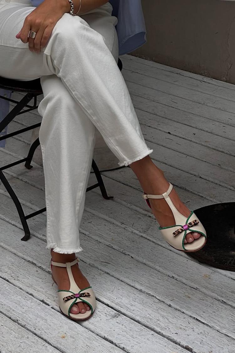 Sandali beige con punta aperta, cinturino a T e fibbia con fiocco decorativo [Pre-ordine]