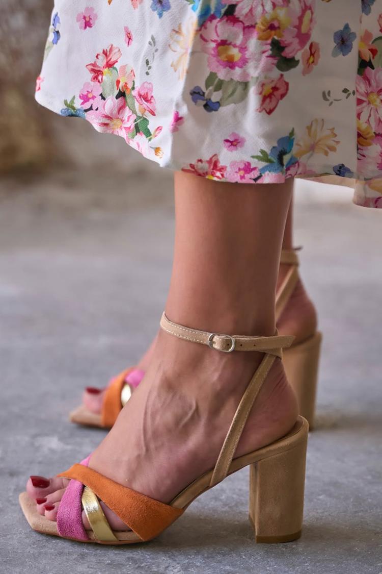 Sandali con tacco beige con cinturino posteriore e punta affilata, rifiniture grezze colorblock