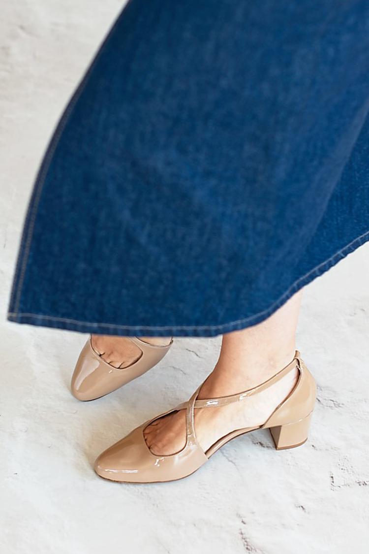 Scarpe con tacco grosso color cachi, con cinturino incrociato e punta affilata, tinta unita [Pre-ordine]