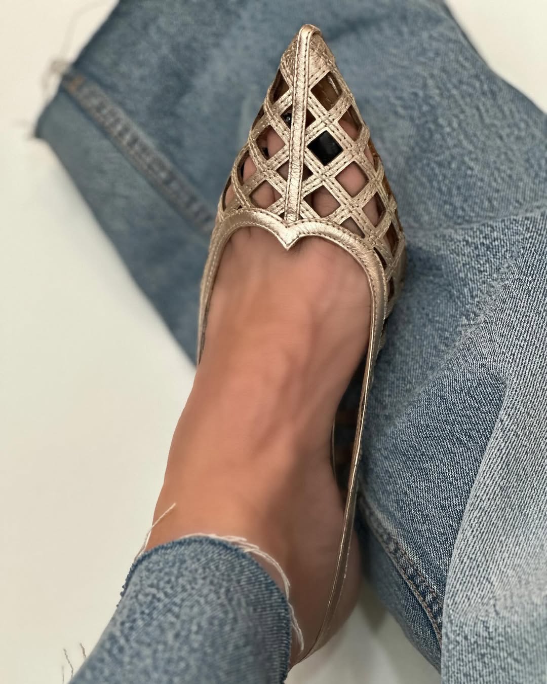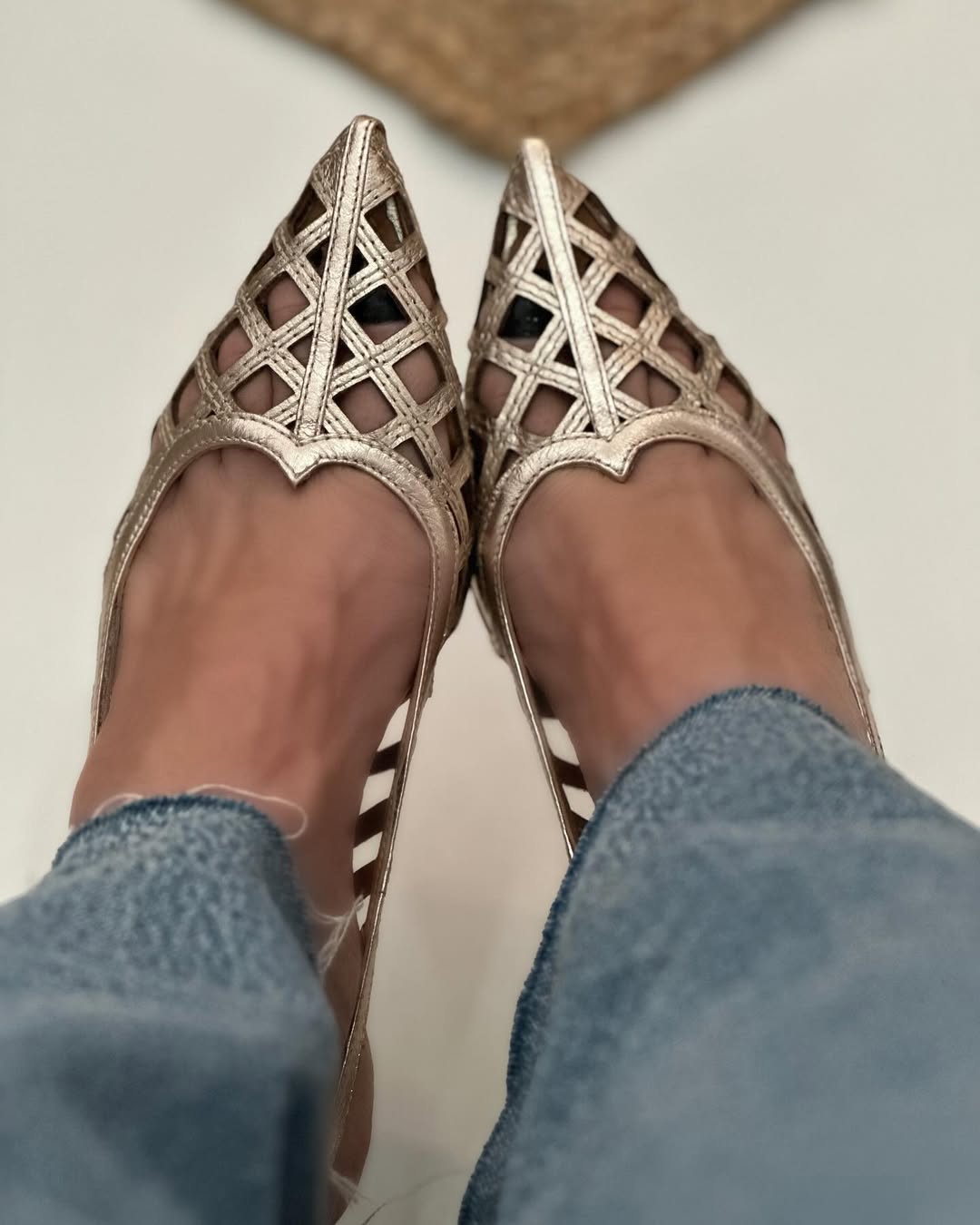 Décolleté con tacco alto e punta aperta in metallo dorato con incrocio [Pre-ordine]