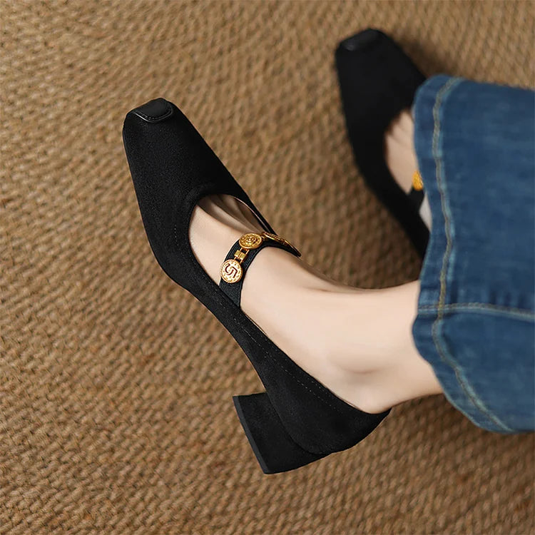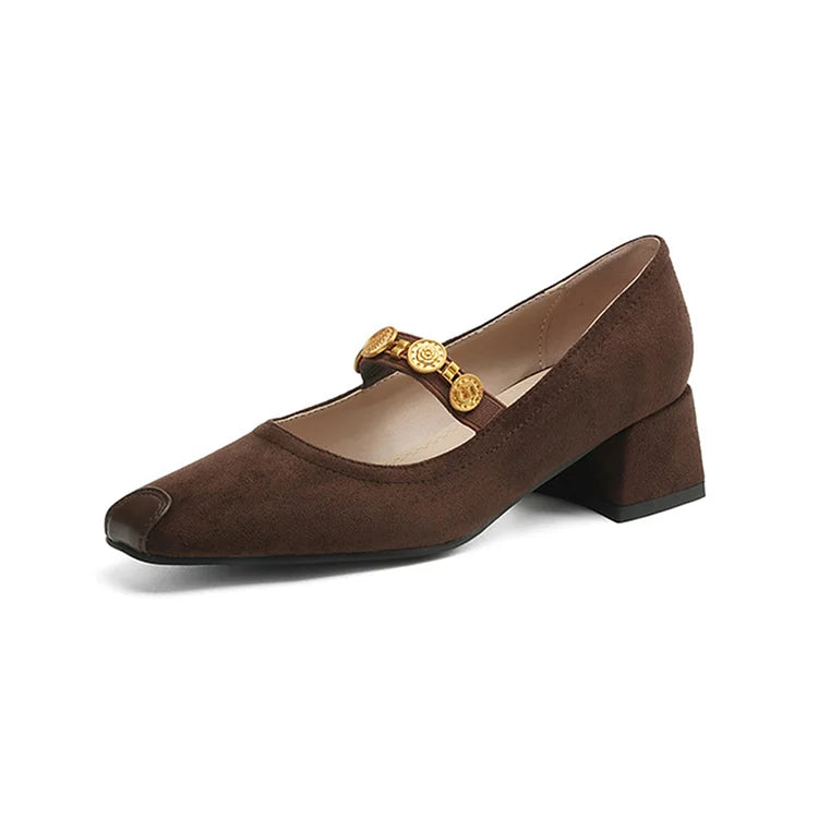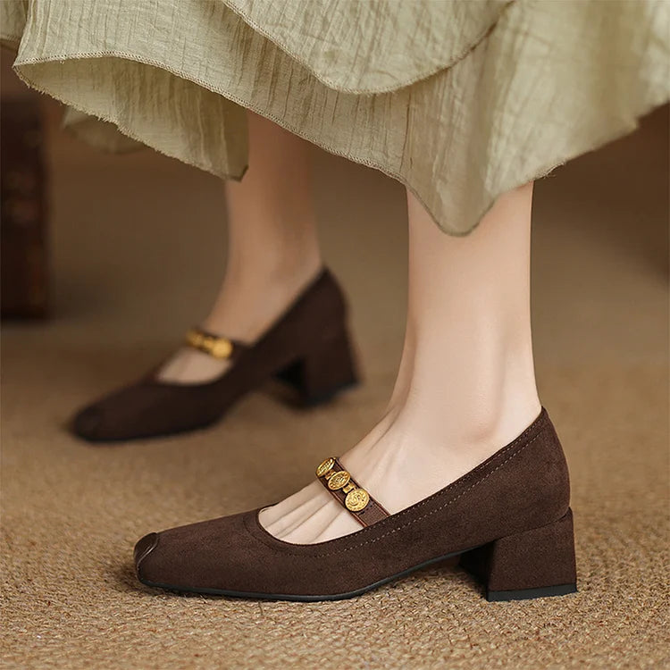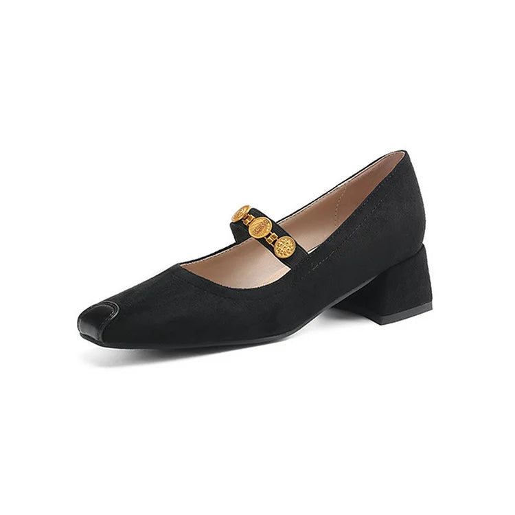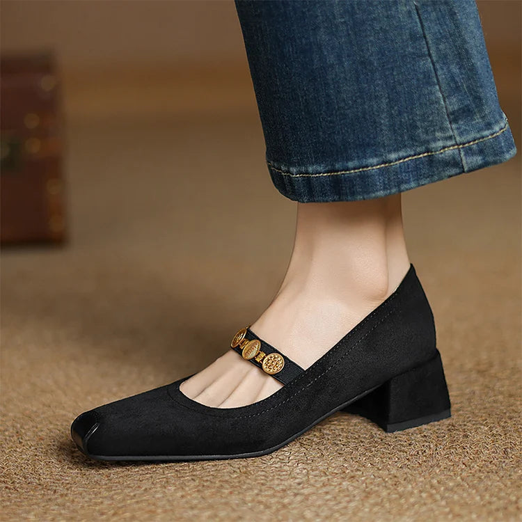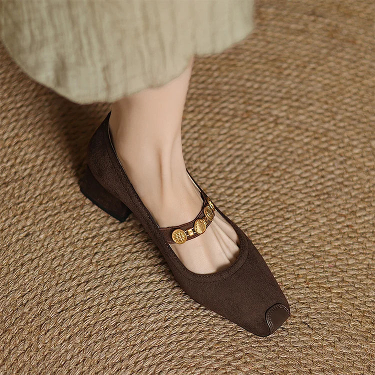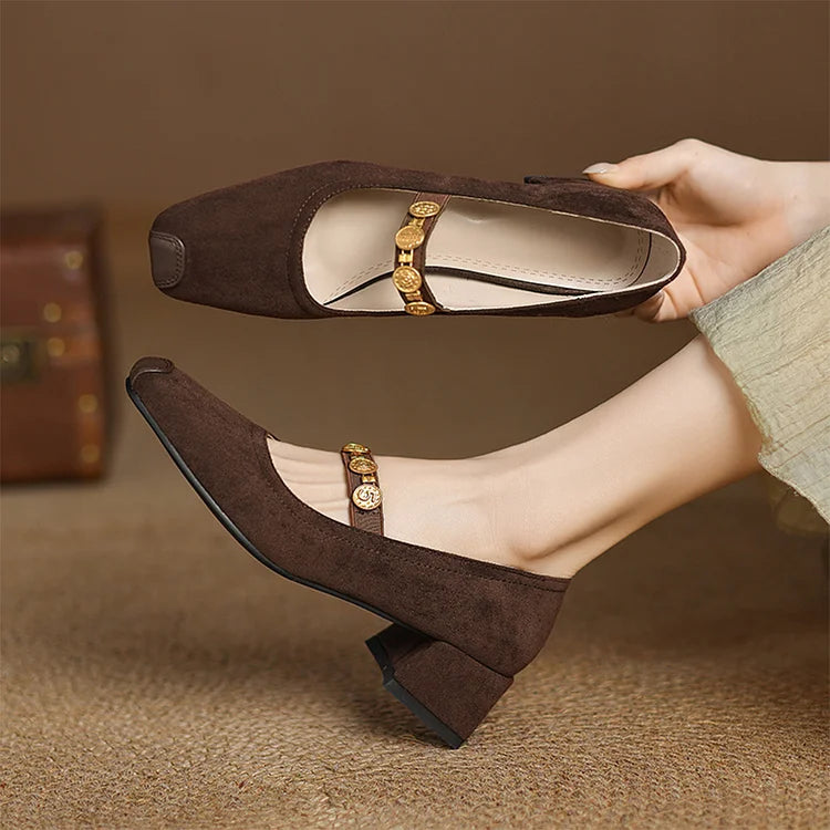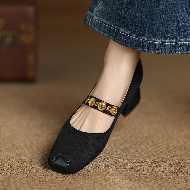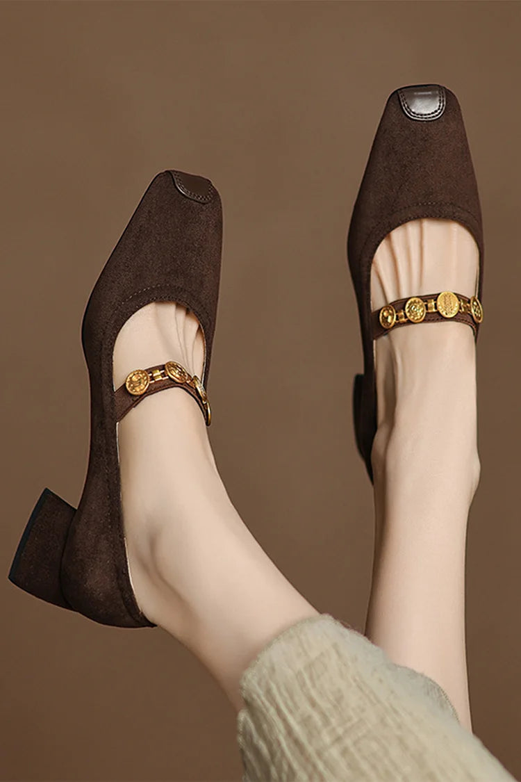 Catena con moneta in metallo, cinturino sul collo del piede, patchwork, punta quadrata, tacco spesso