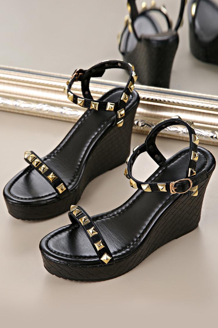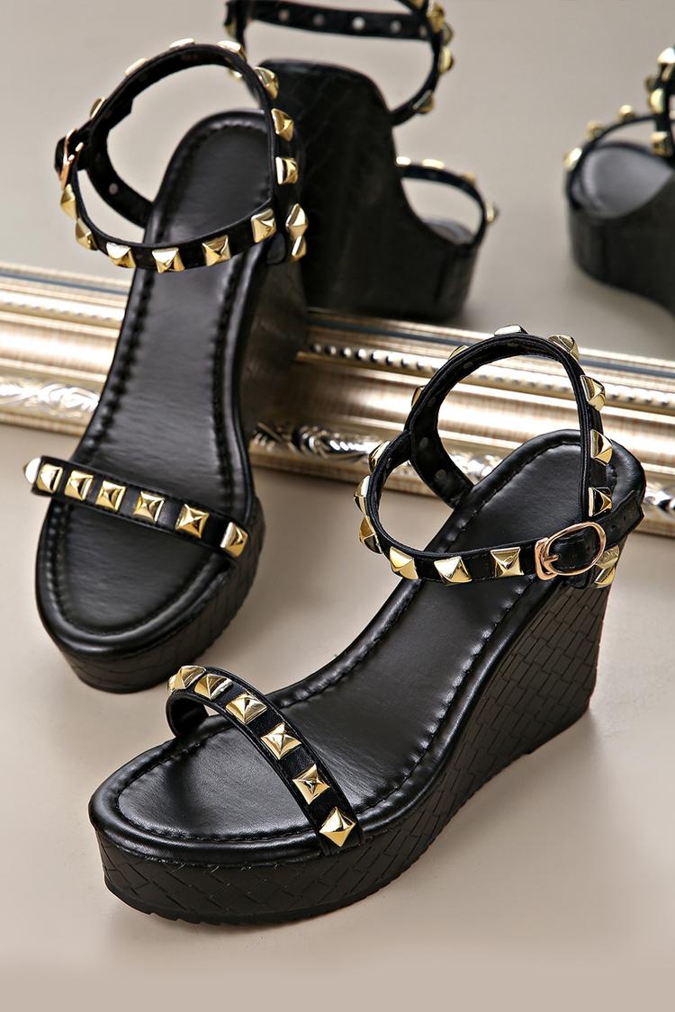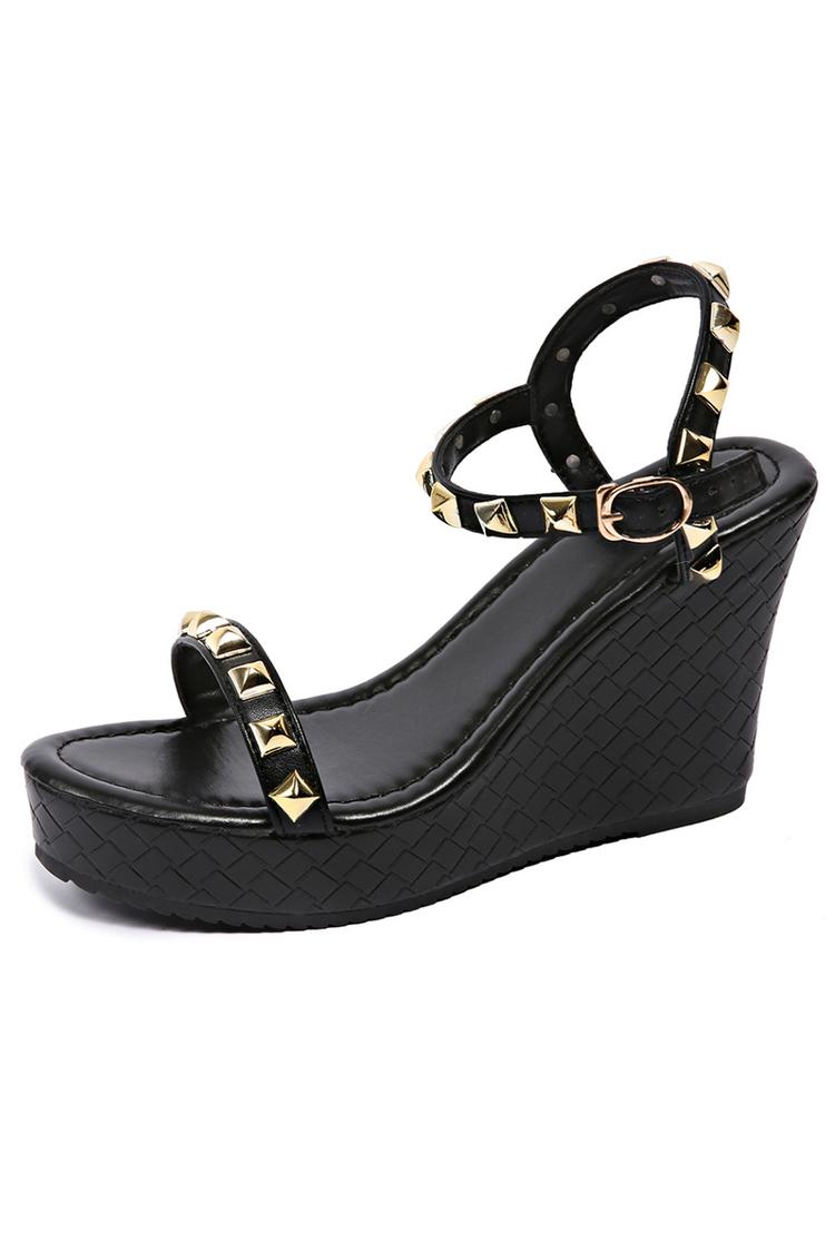 Zeppe con punta tonda, cinturino alla caviglia con fibbia e rivetti in metallo