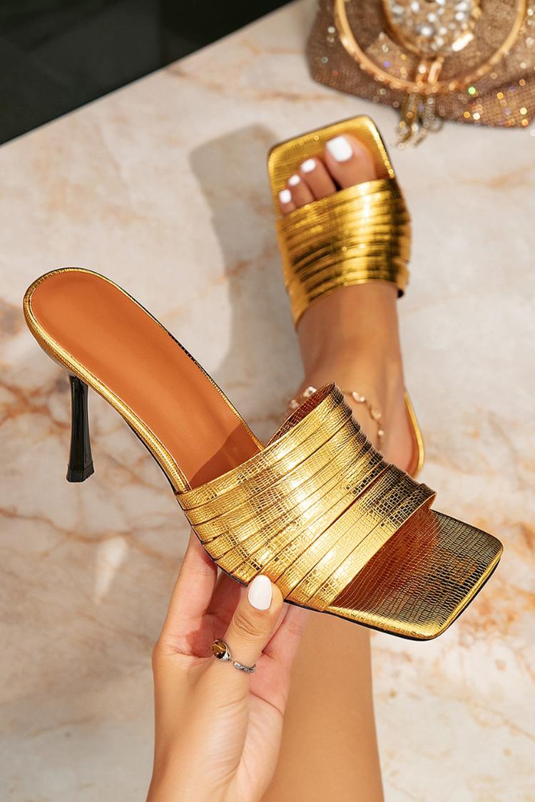Scarpe con tacco a spillo a punta quadrata con cinturini multipli in metallo lucido
