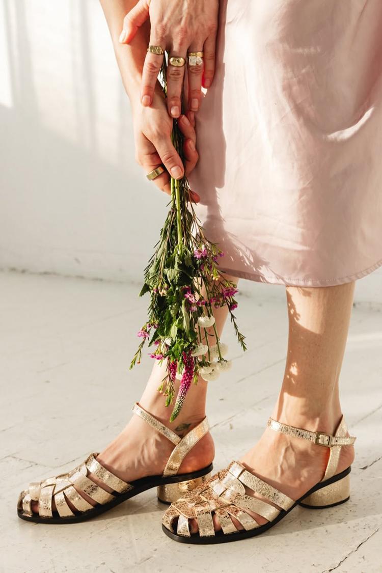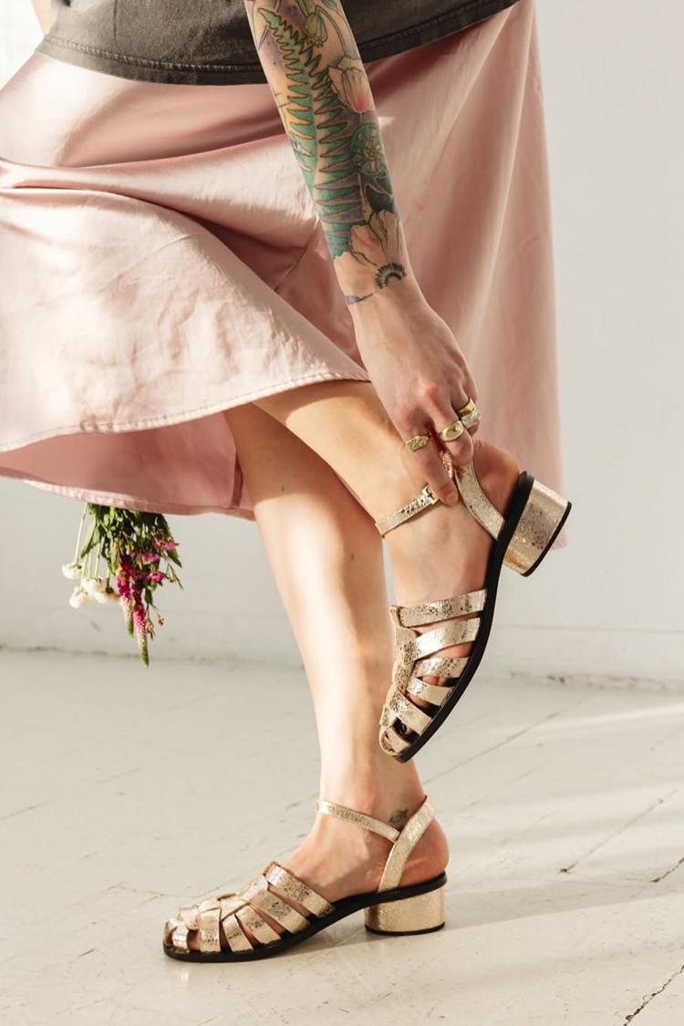 Scarpe con tacco grosso in tessuto traforato dorato effetto metallizzato [Pre-ordine]