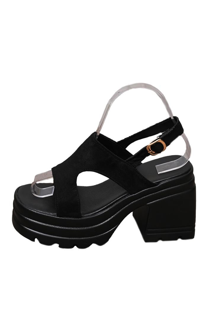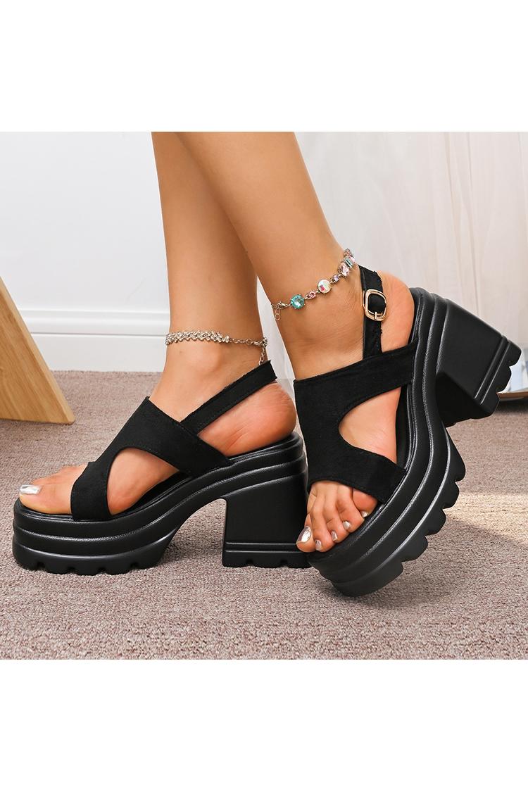 Scarpe con tacco grosso, punta aperta, cinturino posteriore con fibbia e ritaglio in tinta unita