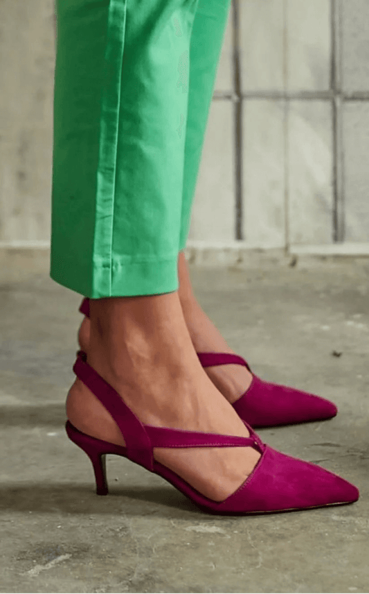 Levendig fuchsia suède T-band puntige hakken [Pre-order]