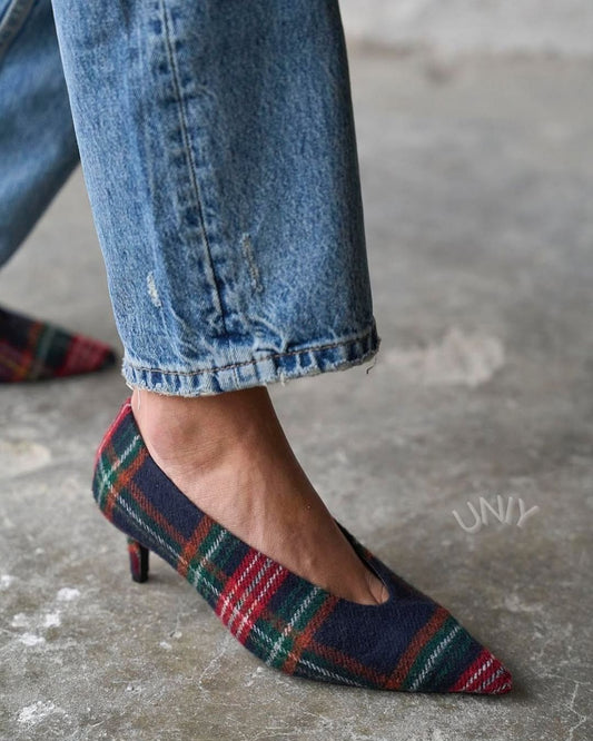 Retro kleurvlakken puntige neus V-hals kittenhak pumps [Voorbestelling]