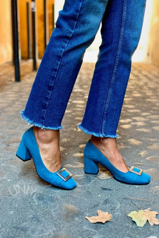 Lappeteppe metallpynt firkantet tå marineblå kraftige hæler
