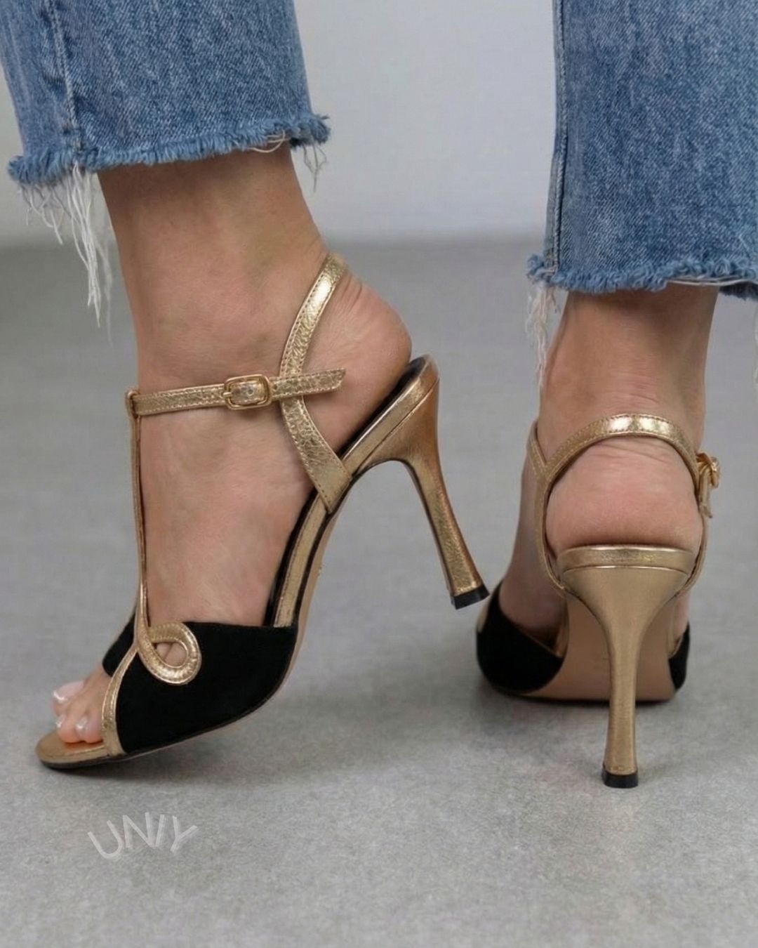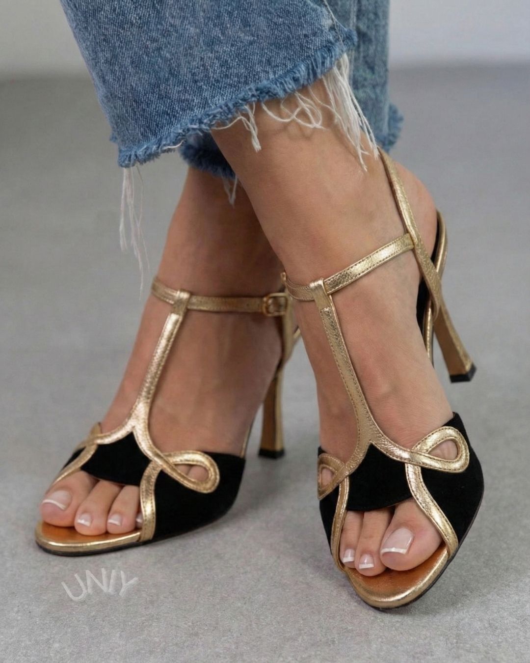 Elegant svarte metalliske hæler med remmer, T-rem og ankelrem [Forhåndsbestilling]