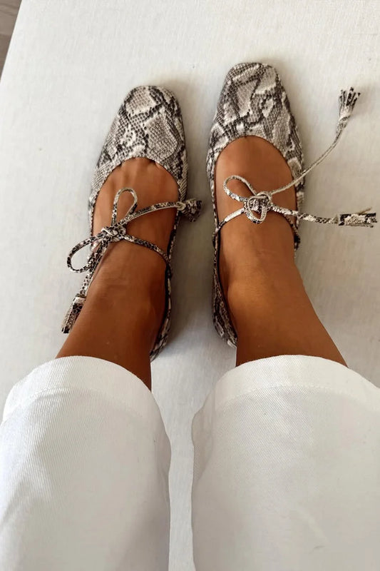 Szare baleriny na płaskim obcasie z kwadratowym noskiem i nadrukiem w węża, wiązane [Przedsprzedaż]