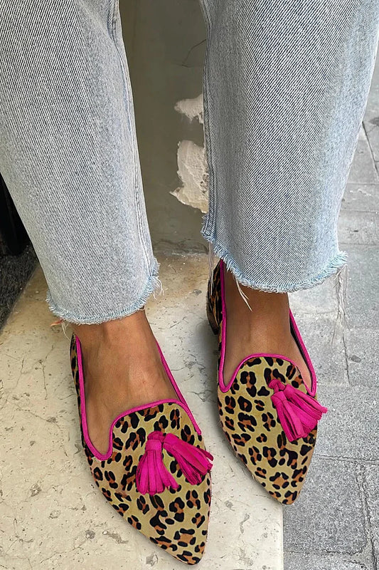 Casualowe szpiczaste baleriny z chwostami i nadrukiem w cętki lamparta zamszowe ekologiczne