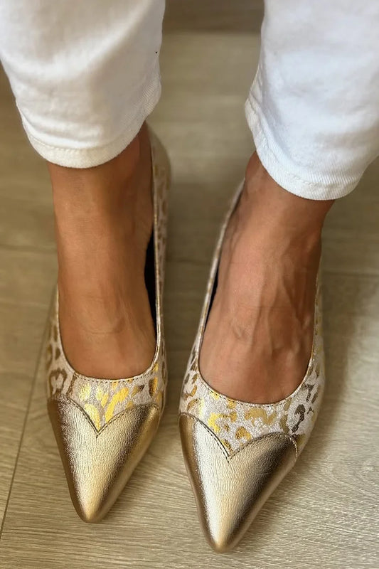 Błyszczące metaliczne złote baleriny w cętki z łatek, spiczasty nosek [Przedsprzedaż]