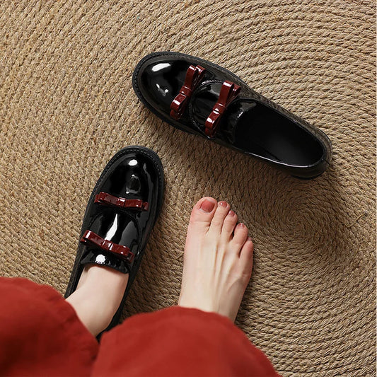 Błyszczące mokasyny z kokardą z kryształków, ozdobione przeszyciami, z okrągłym noskiem