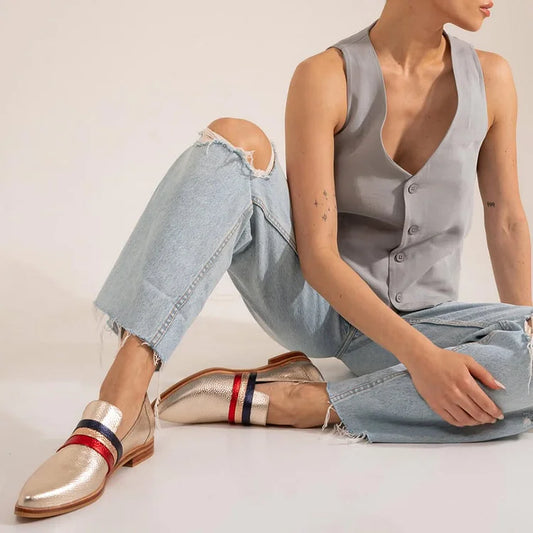 Mokasyny w kolorowe paski z metalicznym połyskiem, złote, z noskiem w szpic [Przedsprzedaż]