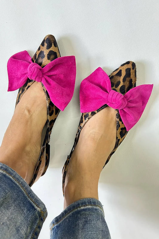 Brązowe mokasyny z nadrukiem w cętki, ozdobą w formie kokardy i szpiczastym noskiem [Przedsprzedaż]