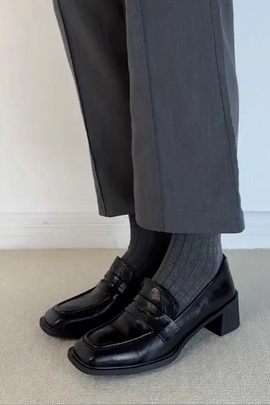 Skórzane mokasyny w kolorze jednolitym z kwadratowym noskiem, grubym obcasem i patchworkiem