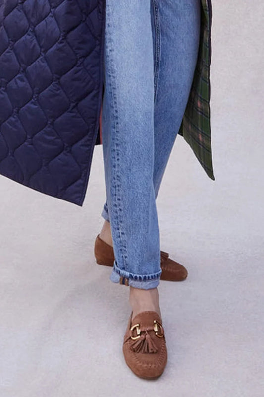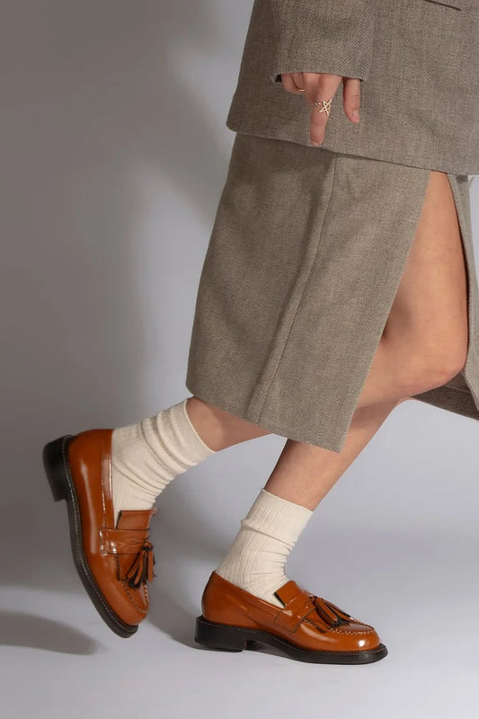 Mokasyny z frędzlami, okrągły nosek, wsuwane, niski obcas, jasnobrązowe [Przedsprzedaż]