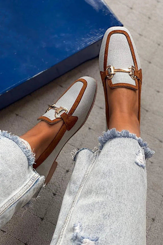 Beżowe mokasyny Colorblock z metalową dekoracją i kwadratowym noskiem [Przedsprzedaż]