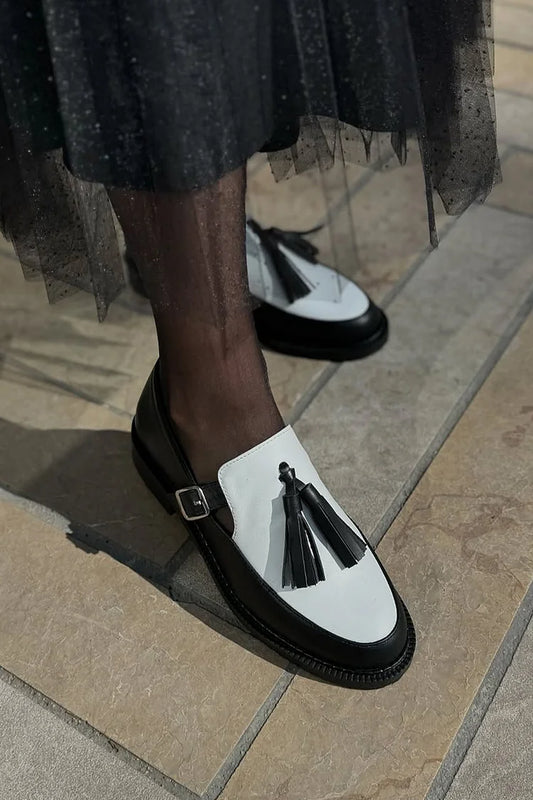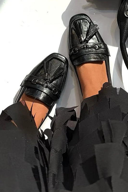 Czarny mokasyn z kwadratowym noskiem, niskim stanem, ozdobą z frędzli i klamrą [Przedsprzedaż]