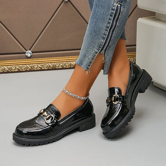 Casualowe mokasyny z okrągłym noskiem, ozdobą w postaci metalowej klamry i wzorem krokodyla