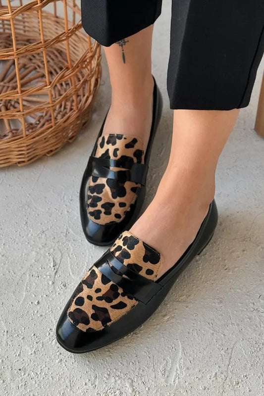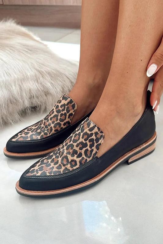 Czarne mokasyny w panterkę z ostrym noskiem i bocznym wycięciem w kształcie litery V [Przedsprzedaż]