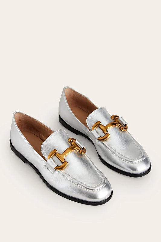 Metalowe dekoracyjne mokasyny z okrągłym noskiem i metalicznym połyskiem w kolorze srebrnym [Przedsprzedaż]