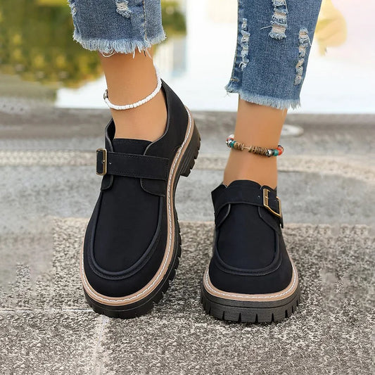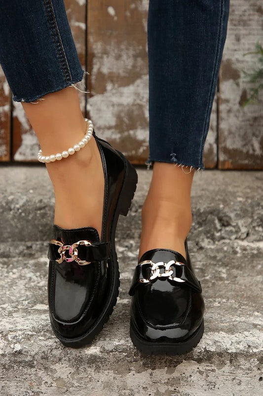 Metalowy łańcuch dekoracyjny, okrągły nosek, niski blokowy obcas, casualowe loafersy
