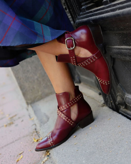 Burgundy Studded Cross Strap Pointed Toe Cut-Out Ankle Boots