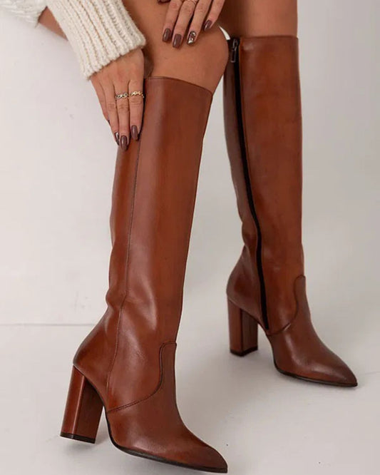Classic Brown Pointed Toe Block Heel Knee High Boots [Pre Order]