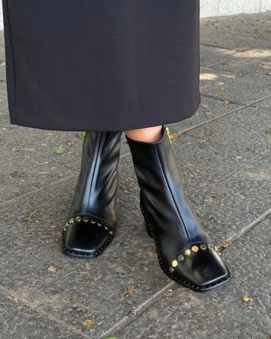 Black Square Toe Rivet Detail Block Heel Boots [Pre Order]