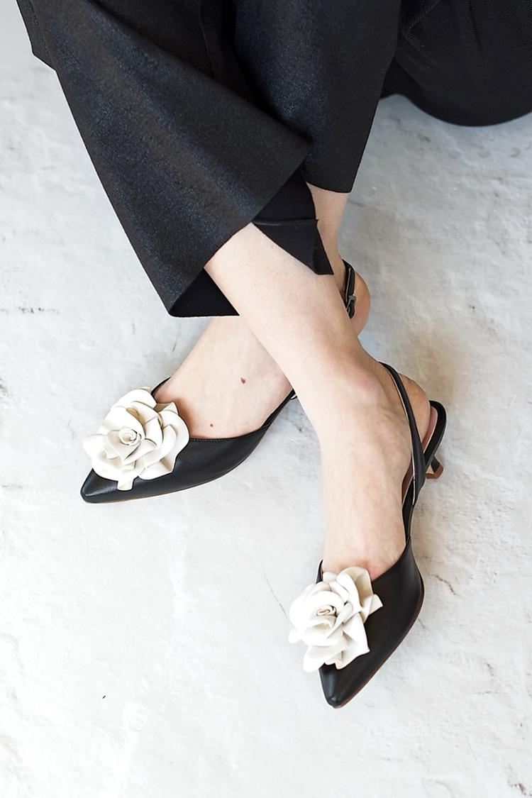 Dekoracja 3D Kwiat Szpiczasty Nosek Sandały na Obcasie Kitten Czarny [Przedsprzedaż]