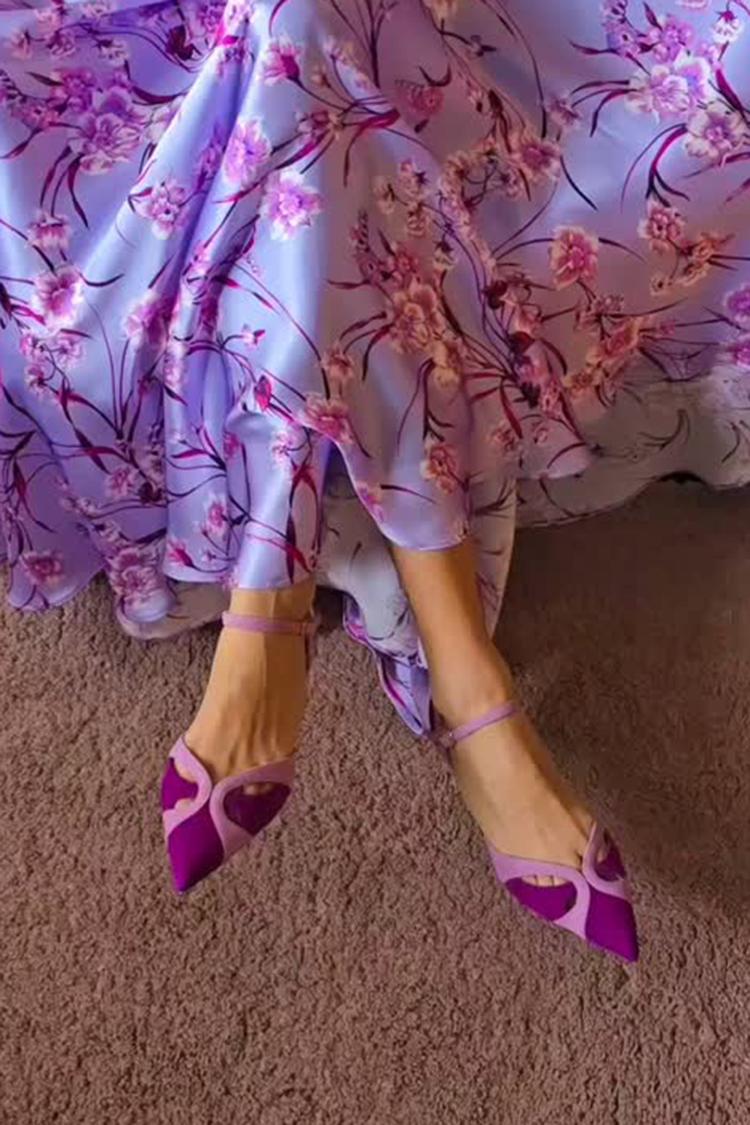 Ażurowe sandały na kostkę z zamkiem, szpiczastym noskiem i fioletowymi koturnami