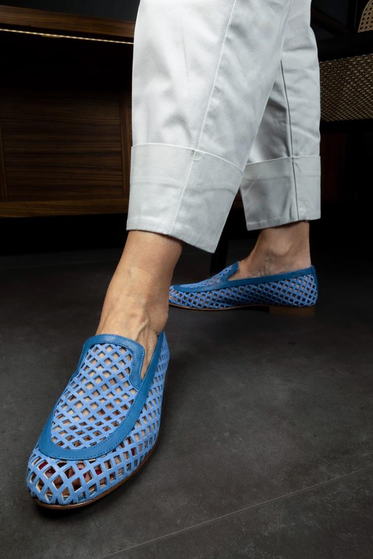 Ażurowe mokasyny z okrągłym noskiem w kolorze niebieskim z łączonych materiałów [Przedsprzedaż]